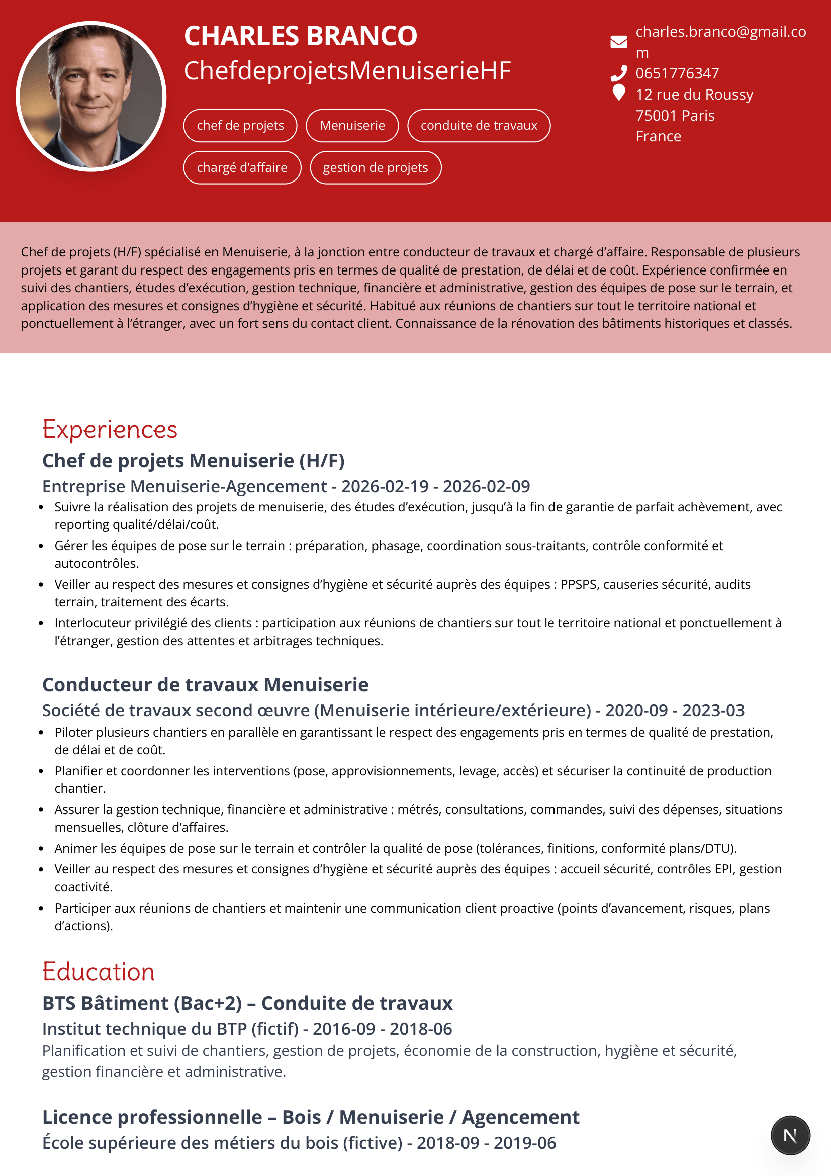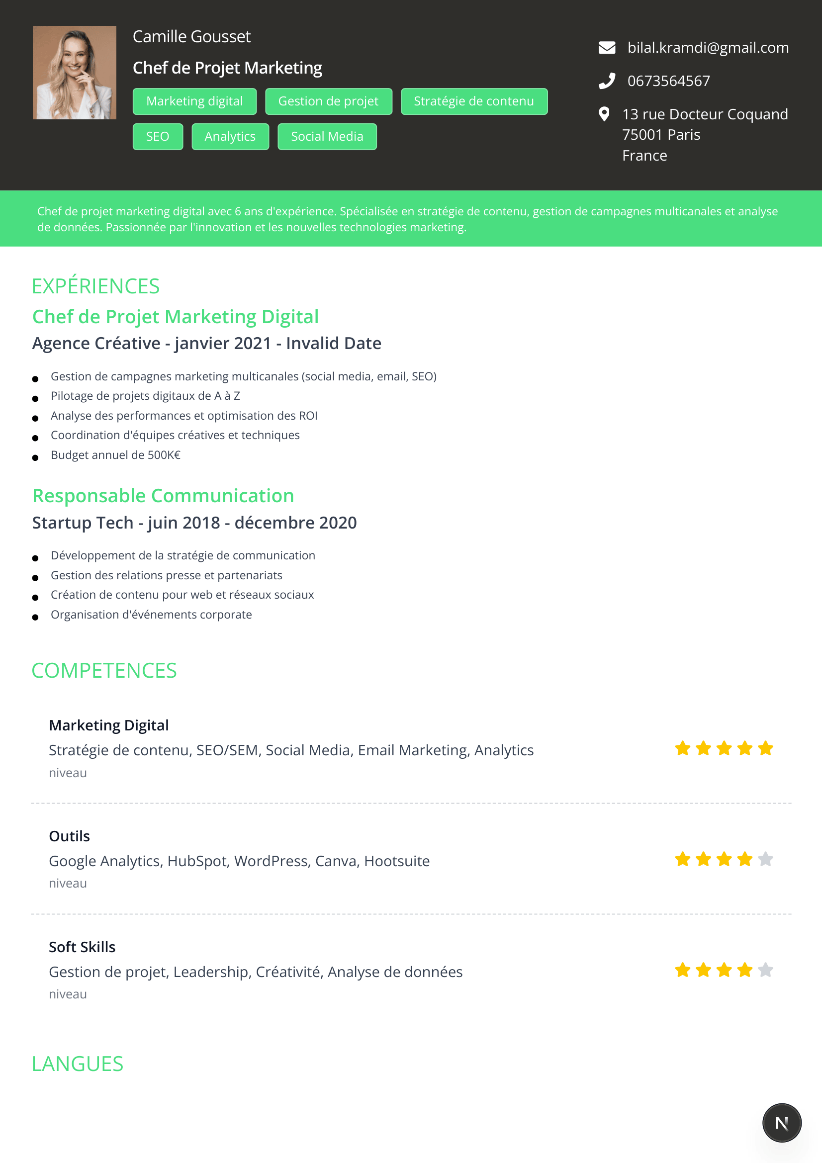 Collez l’annonce : l’IA structure, cible les mots-clés, et génère un CV sur-mesure. Jusqu’à +60% de matching (selon l’offre et le profil).